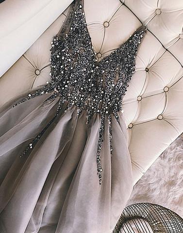 H98 Gray V-Neck Pretty Beaded Short Homecoming Dress
