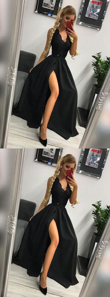 V-Neck Evening Dress Satin Prom Gowns Black Prom Dresses