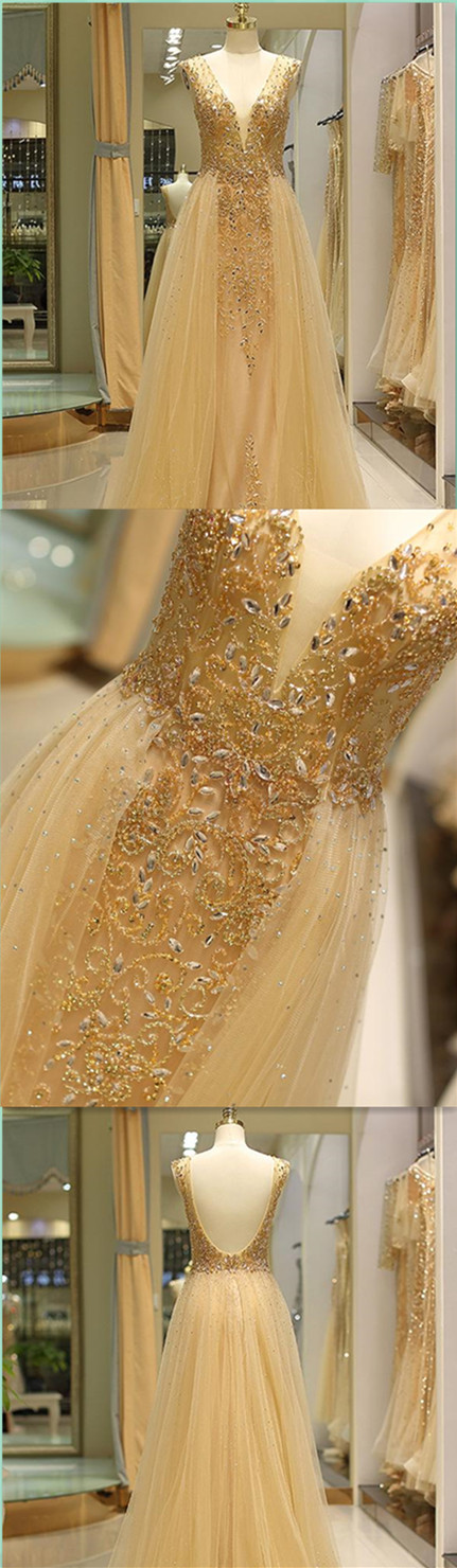 V-Neck Evening Dress Gold Prom Gowns,Prom Dresses Z33