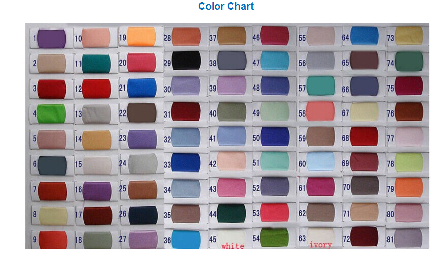 All color are available from our color chart . Since computer screens have chromatic aberration, especially between CRT screen and LCD screen, we can not guarantee that the color of our products will be exactly the same with the photographs you saw.